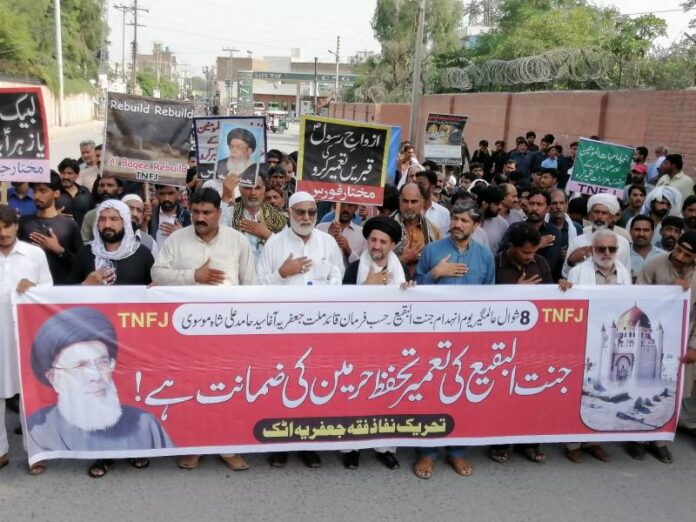 Protests were held in press clubs and public places in all the small and big cities, towns and villages of Pakistan. Practically manifesting their devotion to the Holy Prophet (peace be upon him and his progeny), Ahle Bait e Athaar and Sahaba Ikram (RA), the protesters demanded the reconstruction of holy shrines of the daughter of the Prophet, the Lady of Paradise, Hazrat Fatima Zahra (peace be upon her), the Ahle e Bait, the mothers of the believers Hazrat Khadija Tul Kubra, Hazrat Ayesha, Hazrat Hafsa, Hazrat Uthman, Chief of Paradise Imam Hassan (a), Imam Zain ul Abideen (a), Imam Muhammad Baqir (a) and Imam Jafar e Sadiq (a). On this occasion, a strong protest was raised against the desecration of Islamic rites (sha’a’ir) in Western countries and India.